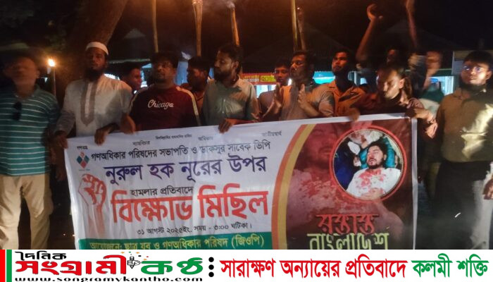 ব্রাহ্মণবাড়িয়ার বিজয়নগরে মশাল মিছিল ভিপি নুরের ওপর হামলার প্রতিবাদে।